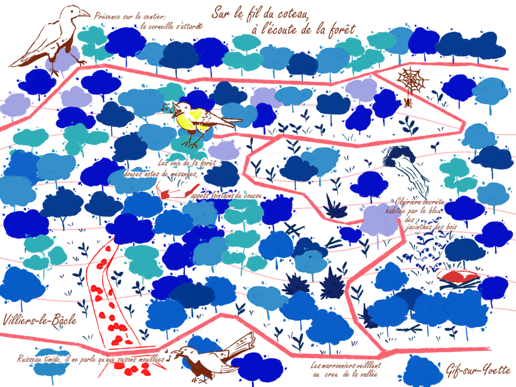 Chaque année depuis trois ans, nous organisons un concours pour intéresser le grand public aux questions de la forêt à travers diverses pratiques artistiques. Après avoir réalisé un concours de photographie et un concours de poésie, le thème de l’édition 2025 était la cartographie sensible en partenariat avec l’IGN (Institut national de l’information géographique et forestière) et l’artiste-cartographe Caroline Evain !
