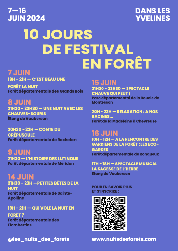 Le Département des Yvelines compte aujourd’hui 68 Espaces Naturels Sensibles (soit 2 880 ha de terrain acquis depuis 1990) qui présentent des fonctions paysagères ou écologiques remarquables ou menacées. À l’occasion du festival des Nuits des Forêts, le Département des Yvelines, en collaboration avec plusieurs partenaires, proposera plusieurs animations sur neuf sites des Yvelines, pour les redécouvrir de manière originale !